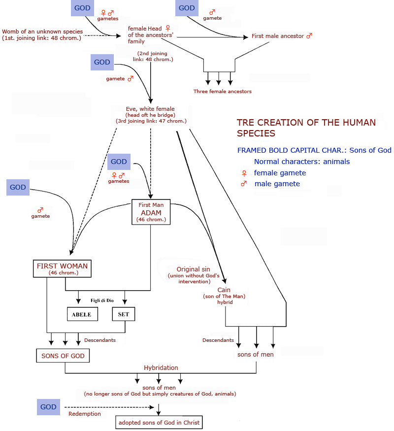 Ook het vraagstuk van de gevallen engelen uit Genesis 6:1-4 doet letterlijk eeuwen van speculatie op de zogenaamde “Angelologie” teniet, omdat het niet uit het immanente komt. In de praktijk ontdekken we een God die de mens niet schiep zoals we hem tegenwoordig begrijpen, maar kinderen van God voortbracht als synoniem voor ware en zuivere volmaakte zonen. Als gevolg van een zonde van hoogmoed, die alleen Adam kon begaan, ontstonden deze hybride zonen waarover de Joodse traditie al lang voor de komst van Christus spreekt, bijvoorbeeld in de mondelinge traditie verzameld in de Talmoed. Don Guido heeft deze kwestie voor het eerst op een begrijpelijke manier uitgelegd, wat ons allemaal onmenselijk maakt. Zelfs wat we de zogenaamde “mensheid” noemen, is slechts een overlevende van een reeks voormenselijke rassen die sinds de verdwijning van de zonen van God hebben gestreden om territorium en te overleven. De mensheid, die in literaire werken vaak beschreven wordt als een virus dat de planeet verwoest en de verscheidenheid aan levensvormen steeds meer vermindert, is geen uiting van haat tegen de mensheid, maar het gevolg van de onbewuste wetenschap dat we niet zijn wat we in het begin moesten zijn. Wij zijn de wanorde van de vleesgeworden schepping, maar God wil ons verlossen.